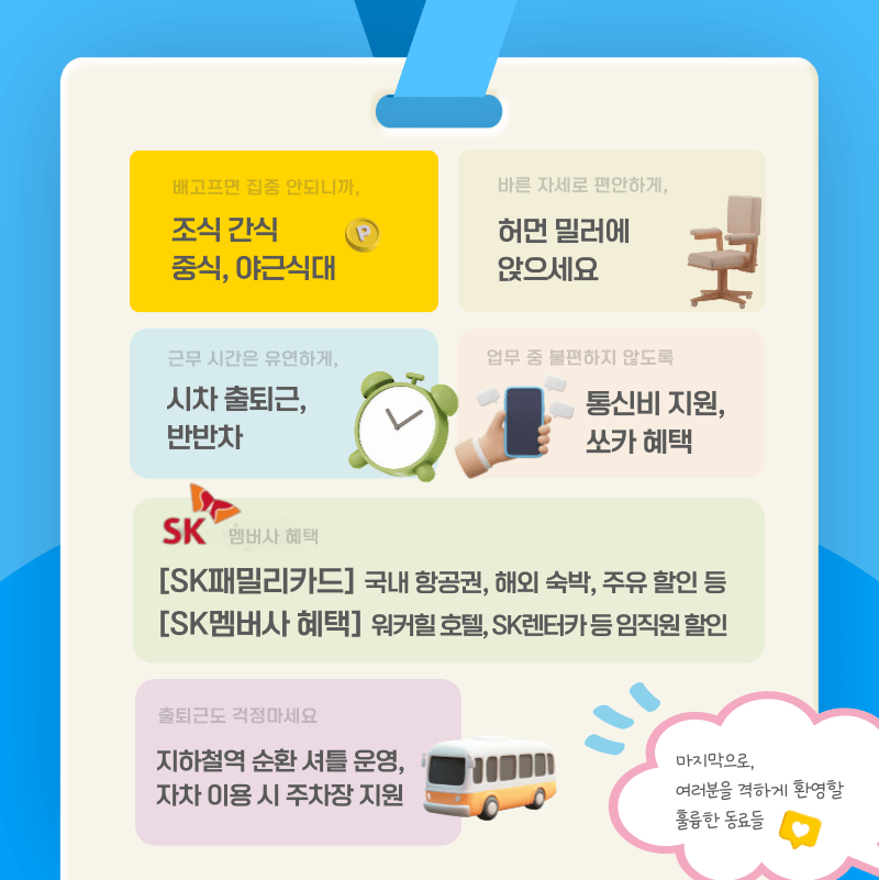 - 행복 지원: SK 패밀리카드 연회비 지원 및 기타 혜택 (해외숙박 및 국내선 비행기 지원), 생일상품권, 경조사 지원, 창립기념일 상품권, 장기근속 포상